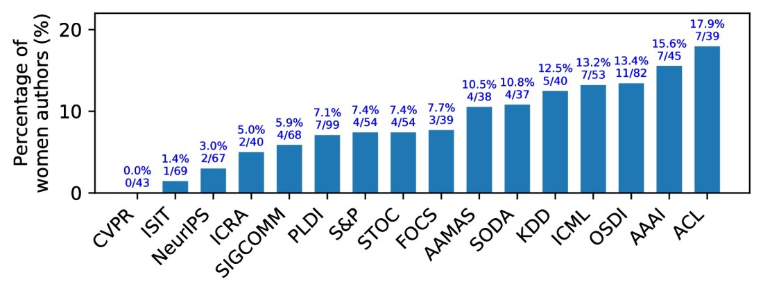 For comparison, all except two award-winning papers (one from ACL and one from FOCS, both single-authored) have at least one male author.